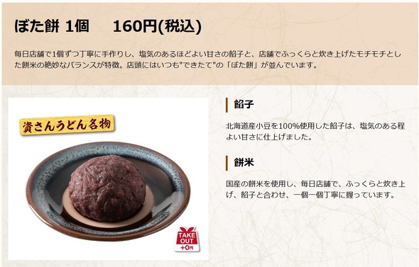 うどんに合わせたトッピングも、天ぷら以外にとんかつやチキンカツ、唐揚げなど揚げ物類を一通りそろえる。1986年から提供している「ぼた餅」も、年間540万個を売り上げるなど、看板商品の一つとなっており、一部店舗ではソフトクリームも提供しているなどスイーツにも事欠かない。ちなみにメニューが重めかつ豊富なのも、肉体労働者のニーズに合わせたためだという。
