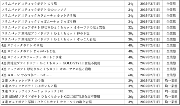 値上げの対象となるのは、「ピュアポテト」「湖池屋ストロング」「カラムーチョチップス」「すっぱムーチョチップス」「スリムバッグ スティックポテト」など33品。いずれもオープン価格で、想定される価格改定率は3〜11%程度となっている。