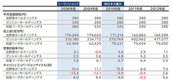 その後、2008年のリーマンショック、2011年の東日本大震災により、多くの企業と同様、牛丼3社も大きな影響を受け、2009年〜13年ごろまでは厳しい状況が続きました。