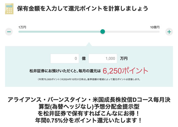 信託報酬の高い投信において、他社を上回る還元率となる投信残高ポイントサービスが松井証券の特徴の一つだ。人気の「アライアンス・バーンスタイン・米国成長株投信Dコース毎月決算型(為替ヘッジなし)」では、1000万円分を預けると毎月6250ポイントが還元される