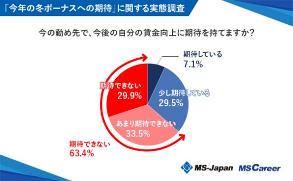 勤務先で自分の賃金向上に期待を持てるかどうかについて「あまり期待できない」(33.5%)と「期待できない」(29.9%)と回答した人が半数以上を占めた。「少し期待している」と回答した人は29.5%だった。
