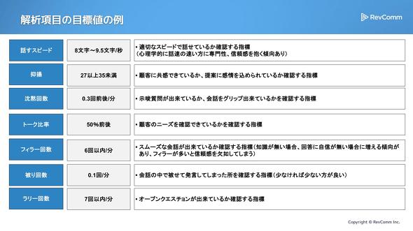 以下の表は、「話すスピード」や「トーク比率」など、各解析項目の目標値の例です。目標値は顧客の属性や取り扱う商材によって変える必要があります。それぞれの項目について詳しく解説します。