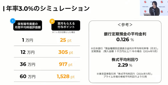 暗号資産を持っていると年3%のポイントとして付く。このサービスを提供するのは、暗号資産サービスを手掛けるメルコインだ。同社の狙いはどこにあるのかというと……。