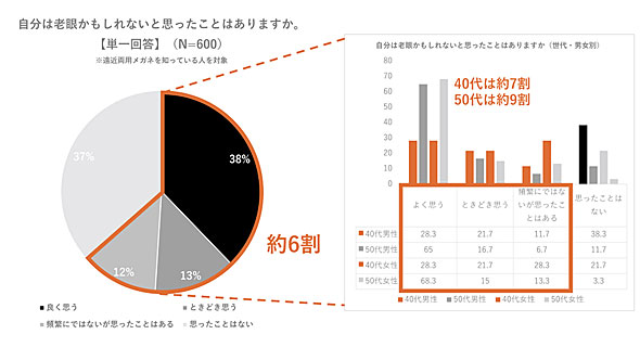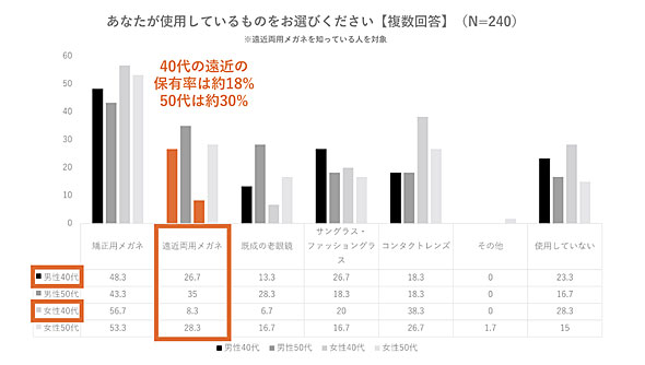 ネオマーケティング社が行った調査によると、40代の約7割が「自分は老眼かもしれない」と回答していますが、遠近両用メガネを保有しているのはわずか18%。その理由として「高価だから」「使いにくそうだから」といった答えが上位にランクイン。この結果を受け、同社は「まずは試してもらいたい。そのために、追加料金を廃止するのはどうか」と考え、この企画を進めたそうです。