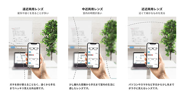 遠近両用レンズの特徴は、レンズの上から下にかけて境目のない設計で度数が変わるので、メガネをかけ替えることなく、遠・中・近が見えること。ただ、視界のひずみや視野の狭さなどを感じるので、慣れていない人からは「使いにくい」といった声もあります。
