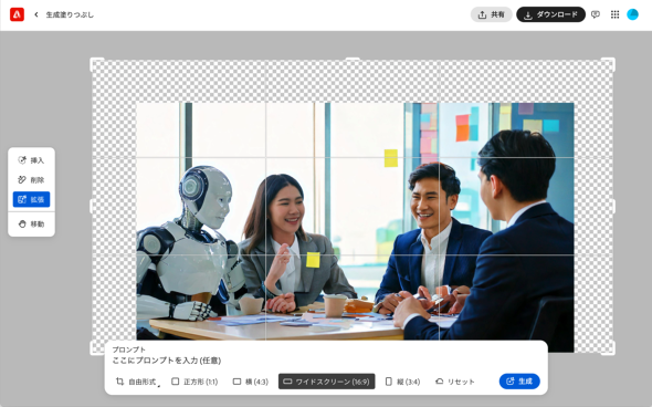 画像の背景を広げたい場合は、左側のメニューで「拡張」を選び、拡大範囲を指定して「生成」をクリック。4つの候補が表示されるので、気に入ったものを選ぶ。文字を入れるスペースを確保したい時などに重宝する機能だ。