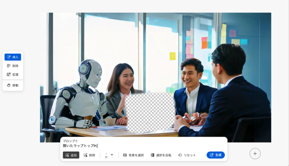 続いて、画像内の不自然な箇所を修正していく。左側のメニューで「挿入」を選び、下部のメニューで「追加」を選んだら、テーブルの上の正体不明なものが置かれた部分を広めに選択。プロンプトに「開いたラップトップPC」と入力して生成を行うと、PCが置かれた画像に変わった。