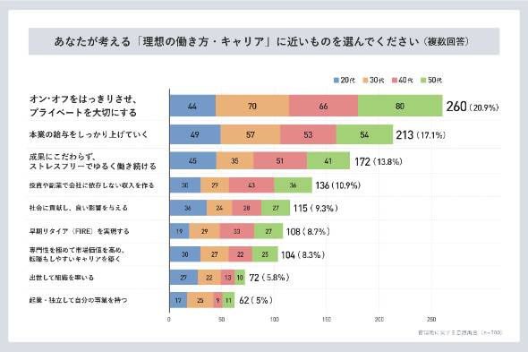 理想の働き方として最も多かったのは、「オン・オフをはっきりさせ、プライベートを大切にする」(260人)だった。「本業の給与をしっかり上げていく」(213人)、「成果にこだわらず、ストレスフリーでゆるく働き続ける」(172人)が続いた。