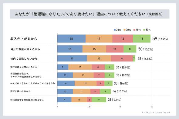 管理職を志向する人に理由を聞くと「収入が上がるから」(59人)が最も多く、次いで「自分の裁量が高まる」(50人)、「社内で出世したい」(49人)となった。権威ややりがいよりも、収入の増加が主な動機になっているようだ。