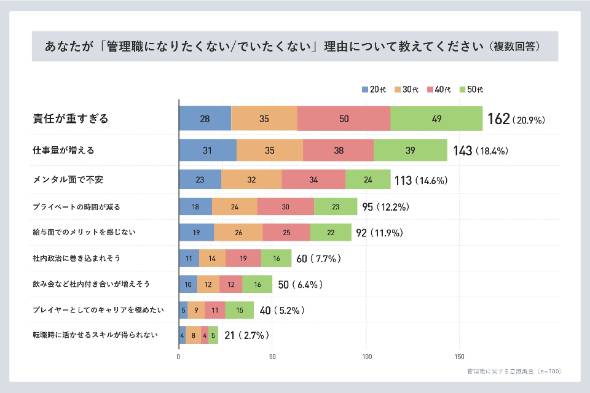 一方で、管理職を望まない人の理由は「責任が重すぎる」(162人)が最も多く、「仕事量が増える」(143人)、「メンタル面での不安」(113人)が続いた。令和のビジネスパーソンは、社内での地位や権限よりも、収入や時間といった個人の生活の質を重視している。