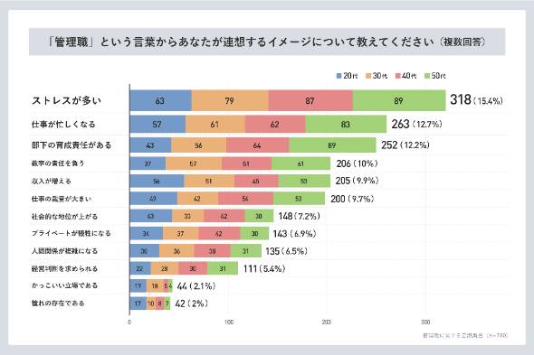 管理職に対するイメージは「ストレスが多い」(318人)、「仕事が忙しくなる」(263人)といったネガティブな回答が上位を占めた。また、「部下の育成責任がある」(252人)という回答も多く、特に40代以上では責任感や業務負担に対する意識が強くなっている。
