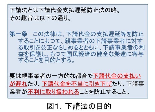 また工場内物流業務をアウトソースするとそれは製造委託ということで下請法の対象にもなる。下請法は正式には「下請代金支払遅延防止法」と言い、親会社と下請会社との間の取引において、下請取引の公正化・下請事業者の利益保護を目的としている。概略を図1、図2にそれぞれ記したのでそちらを参照いただきたい。