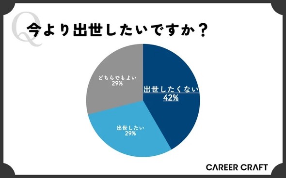 今より出世したいか聞くと、全体の42%が「出世したくない」と回答した。「どちらでもよい」(29%)と合わせると、約71%が出世を望んでいない(出世意欲がない)ことが分かった。