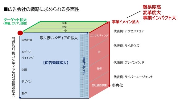 図にあるような代表的な企業は、広告会社とは一線を画すビジネスモデルやノウハウで高い成長性と収益性を保持しています。この多面的で「立体パズル」のような戦略のうち、自社がどこに向けて舵(かじ)を切るのか、最適な一歩を必ず見出さなくてはなりません。