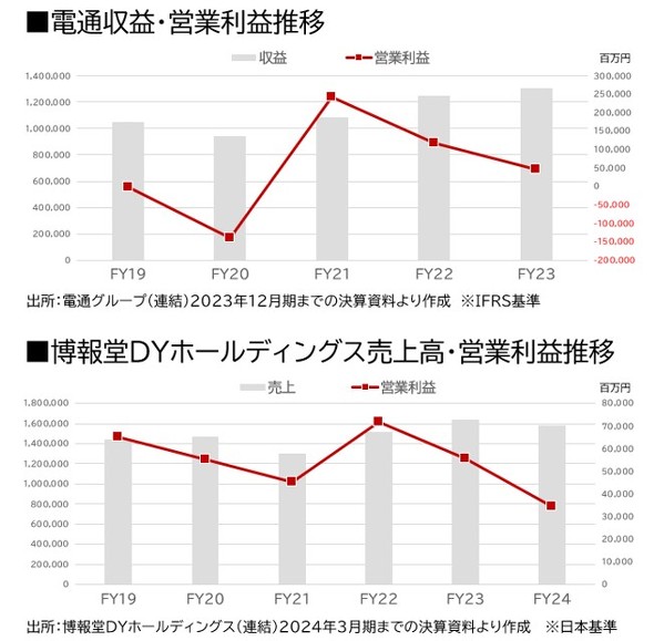 ここまで代表例として挙げた企業と、大手広告会社との比較を見ていきます。まず広告会社大手2社の業績推移を紹介しましょう。両社とも売り上げと収益は伸長しているものの、営業利益高は減少傾向です。業界のトップ2社が、大変類似した傾向になっているのが分かります。