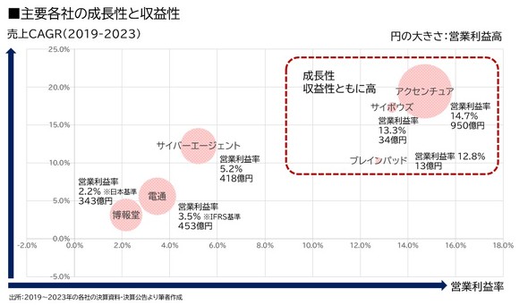 次に、前出の図に代表例として記した企業を加え、売り上げの成長性と営業利益率、営業利益高を見ていきます。右上のゾーンが成長性、収益性ともに高いゾーンです。大手広告会社3社よりも高いポジションにあることが分かります。