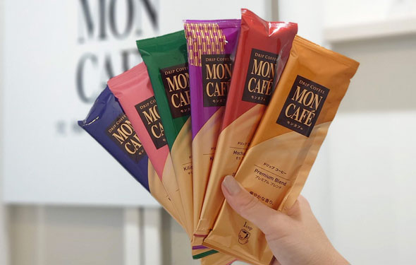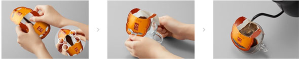 1杯型のドリップコーヒーの飲み方といえば、キリトリ線に沿って開封し、それを左右に広げる。本体をカップのふちにかけて、お湯を注ぐだけ。スーパーなどで販売している商品の多くは、この方法で飲めるが、モンカフェは違う。フィルターの合わせ目を開き、しっかりと折り曲げる。カップのフチをはさむようにしてセットして、お湯をかけるという流れだ。
