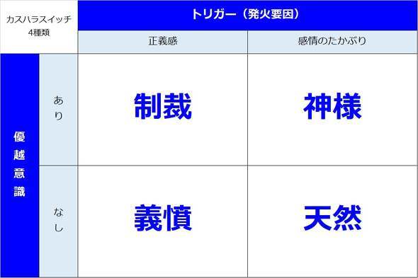 カスハラを次のように4つに分類すると、自身の感情の自制や、感情的になった他者への対処に役立つ可能性があります。相手に対する優越意識の有無を縦軸、トリガー(発火要因)が「正義感」か「感情のたかぶり」かを横軸にとって分類してみます。