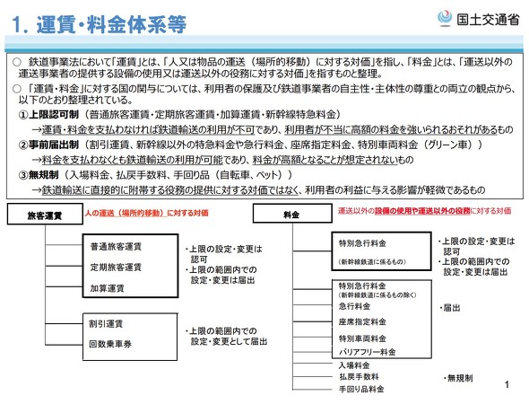 鉄道の「運賃」つまり乗車券代は、上限運賃の認可を国に得る必要がある。「料金」にあたる特急券や指定席券は届け出のみで良い(出典:国土交通省、第5回 交通政策審議会 鉄道運賃・料金制度のあり方に関する小委員会)