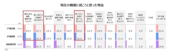 現在の職種を選んだ理由について、IT職の男女ともに「高いスキル・技術が身につくと思ったから」「興味のある業界・業務内容だったから」「学んできたことや経験が生かせるから」がトップ3を占めた。
