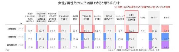 一方で、IT職の女性は「評価」「昇進・昇格」「活躍のしやすさ」「給与」において、「男性の方が優位であると感じる」と回答した割合が高く、これは総合職の女性でも同様の傾向が見られた。