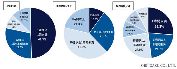社内の会議の回数の平均は「1週間に1回未満」が最も多く49.3%だった。1回の平均所要時間は「30分以上1時間未満」(41.0%)が最も多く、月間の平均所要時間では「1時間未満」(26.3%)が最も多かった。