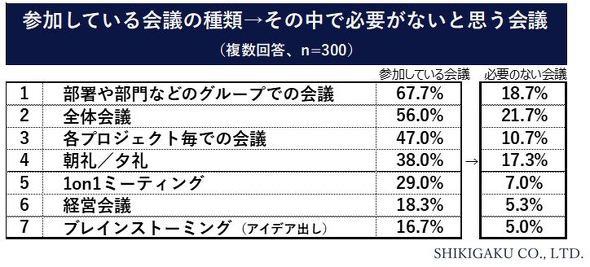 参加している会議で最も多かったのは「部署や部門などのグループでの会議」(67.7%)だった。以降「全体会議」(56.0%)、「各プロジェクトごとでの会議」(47.0%)、「朝礼/夕礼」(38.0%)と続いた。