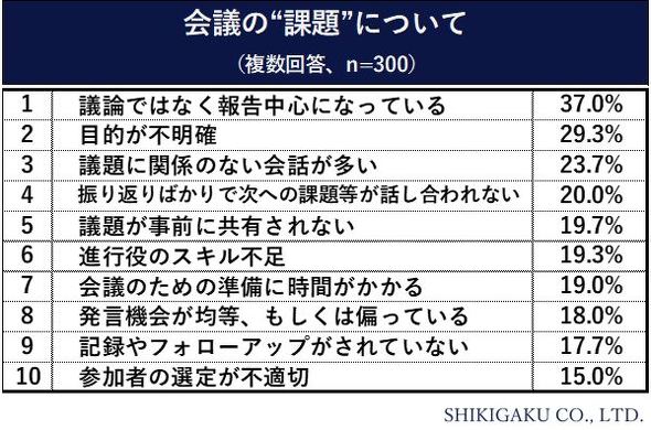 最も多かった回答は「議論ではなく報告中心になっている」(37.0%)だった。以降「目的が不明確」(29.3%)、「議題に関係のない会話が多い」(23.7%)、「振り返りばかりで次への課題などが話し合われない」(20.0%)と続いた。