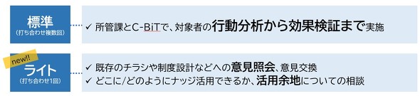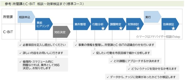 C-BiT発足以降、標準コース9件(対応継続中のものを含む)、ライトコース4件の依頼に対応(例:剪定枝の資源回収量を増やしたい、公園のトイレをきれいに使ってもらいたい、など)。今後は、C-BiTの活動内容を庁内に分かりやすく周知することで、C-BiTへの依頼の掘り起こしや、「このアイデア、うちでもやってみよう」といったナッジの自発的な活用へとつなげていきたいと考えています。