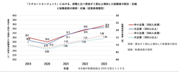 しかし、中小企業に転職したことで、1割以上賃金が増えた転職者も少なくない。リクルートが同社のサービス「リクルートエージェント」のユーザー動向を分析したところ、中小企業への転職で1割以上賃金が増えた転職者の割合の推移は、2019年度の30.1%から、2023年度には35.4%まで上昇した。直近では大企業と比べて賃金が増えた転職者の割合が高くなっているという。