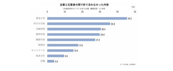 人手不足は深刻だが、応募者が求める条件と折り合わず、採用できないケースも少なくない。リクルートが2024年3月に実施した「中小・中堅企業の事業課題・人材課題に関する調査」によると、中小企業と応募者の間で折り合わなかった内容として回答が最も多かったのは「賃金水準」(45.5%)だった。