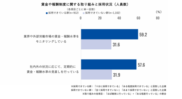 賃金・報酬制度に関する具体的な取り組みと、採用との関係を分析したところ、採用できている企業は、社外にも目を向けた賃金・報酬制度の見直しができていることが分かった。採用できている企業では「業界や外部労働市場の賃金・報酬水準をモニタリングしている」割合が59.2%だったのに対し、採用できていない企業では31.6%にとどまる。「社内外の状況に応じて、定期的に賃金・報酬水準の見直しを行っている」割合も、採用できているでは57.6%だったのに対し、採用できていないでは31.9%だった。