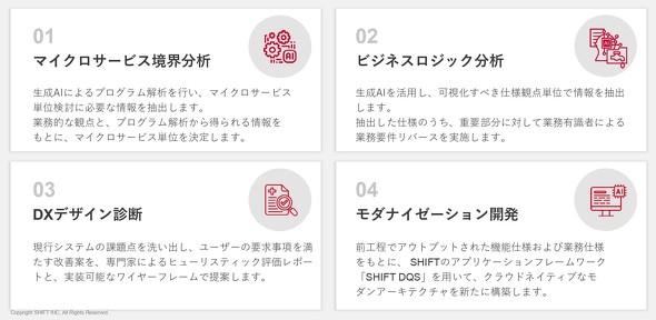 1つ目のステップとなる「マイクロサービス境界分析」は、生成AIによるプログラム解析をし、マイクロサービスを実施する単位を決定させる情報を抽出するものだ。続いて「ビジネスロジック分析」のステップでは生成AIを活用し、業務要件を解析する上で、可視化すべき仕様観点単位での情報を抽出していく。SHIFTが独自に開発している「AIモダナイ解析ツール」により、ブラックボックス化した仕様の可視化を実現させるものだ。