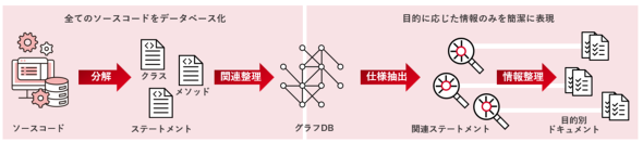 SHIFTは、すでに50社以上に導入されている「AIドキュメントリバース」の技術を発展させた「AIモダナイ解析ツール」を開発している。これは、AIが自動的にプログラムコードを解析し、巨大なプログラムをステートメント単位に解析してデータベース化する。さまざまな観点で仕様情報をデータベースから抽出して整理することによって、データ項目単位の解析を可能とした。
