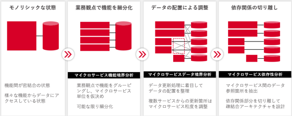 さらに、AIモダナイ解析ツールの情報をもとに、マイクロサービス化の方法論も整備している。業務観点で機能をグルーピングし、マイクロサービス単位を仮決めする「マイクロサービス機能の境界分析」、システムのデータ更新処理に着目してデータの配置を整理する「マイクロサービスデータの境界分析」、マイクロサービス間のデータ参照箇所を抽出する「マイクロサービス依存性の分析」を経て、システムのコンポーネント間の依存関係が少なく、独立性が高い「疎結合アーキテクチャ」を実現するアプローチだ。
