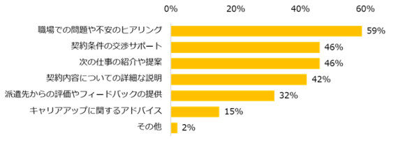 これまで派遣で働いた経験を持つ人に契約更新のタイミングで派遣会社に期待する対応やフォローを尋ねたところ、最も多かったのは「職場での問題や不安のヒアリング」(59%)だった。以降「契約条件の交渉サポート」「次の仕事の紹介や提案」(同率46%)、「契約内容についての詳細な説明」(42%)と続いた。