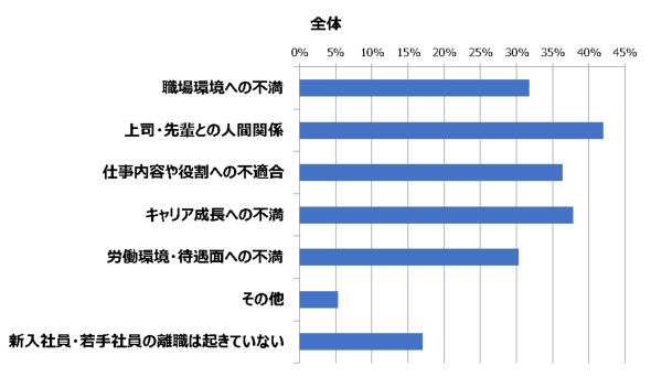 新入社員・若手社員の離職理由として、人事担当者はどんな要因が大きいと考えているのか。最も回答が多かったのは「上司・先輩との人間関係」で42%。「キャリア成長への不満」が38%、「仕事内容や役割への不適合」が36%と続いた。