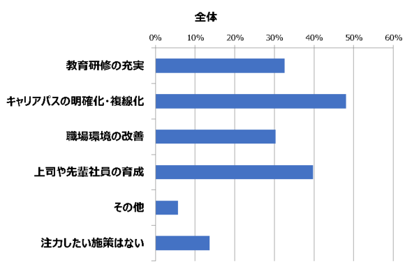 今後、新入社員・若手社員の定着を促すために注力したい施策としては、「キャリアパスの明確化・複線化」が最多の48%。次点で「上司や先輩社員の育成」が40%だった。