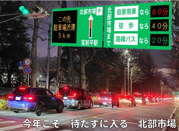 当市場においては、毎年12月28日以降の数日間、年越し・お正月に向けた食材などの買い出しに来られるお客さまで大変にぎわいますが、多くの方が自動車で来場されることにより交通混雑(例年、駐車するまでに1時間以上待つ渋滞)が発生していました。