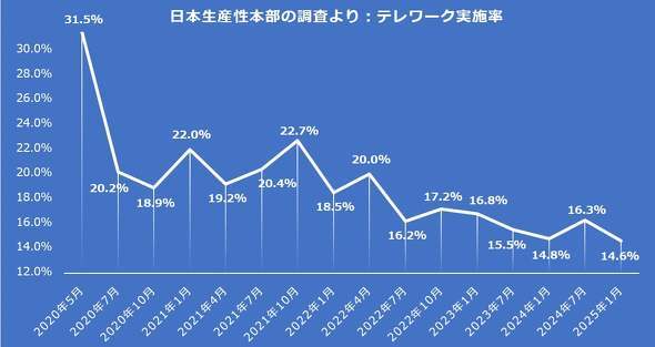 日本生産性本部の「第16回 働く人の意識調査」によると、2025年1月のテレワーク実施率は14.6%。前回調査時より1.7ポイント減少し、コロナ禍で緊急事態宣言が出された2020年5月の31.5%と比較すると、半分以下になっています。