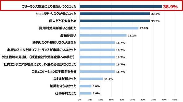 フリーランスのITエンジニアへの発注が減ったと回答した企業担当者に「発注が減った理由」について聞いた。最も多かったのは「フリーランス新法により発注しにくくなった」で38.9%。「セキュリティリスクが気になった」と「個人だと不安」が、ともに33.3%と続いた。
