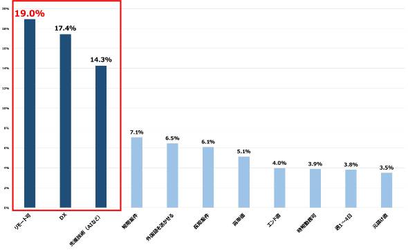 フリーランスのITエンジニアを対象に、発注が増加している案件の特徴を尋ねたところ、1位が「リモート可」(19.0%)、2位が「DX」(17.4%)、3位が「先進技術(AIなど)」(14.3%)となった。