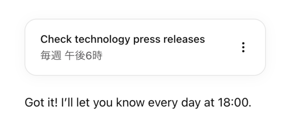 チャット上で登録確定の返答が返ってきたら、これで設定は完了だ。設定した時間になると、そのチャットに情報が送られてくる。ChatGPTの設定からデスクトップ通知やメール通知を設定しておけば、通知を受け取ることも可能だ。