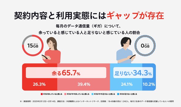 メルカリモバイルの最大の差別化ポイントとなる「ギガの売買」機能。月々のデータ通信量が余っていると感じる人が65%、足りないと感じる人が35%というギャップに着目し、需給をマッチングさせる狙いだ。