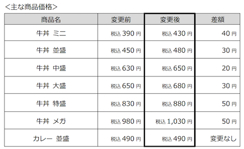 牛丼(並)は450円から480円になるほか、ミニからメガまでの各サイズでそれぞれ20〜50円値上げする。牛丼と並ぶ人気メニューのカレー(並)は490円を維持する。