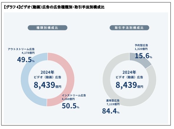 ビデオ(動画)広告は、前年比123.0%の8439億円と、広告種別で最も高い成長率となった。その内訳は、動画コンテンツの間に挿入されるインストリーム広告が4260億円(構成比50.5%)、Web サイト上の広告枠や記事のコンテンツ面などで表示されるアウトストリーム広告が4178億円(同49.5%) となり、ほぼ同水準だった。