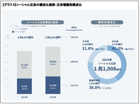 ソーシャル広告は、前年比113.1%の1兆1008億円となり、2019年の推定開始以降はじめて1兆円を超えた。インターネット広告媒体費に占める構成比は37.2%となった。
