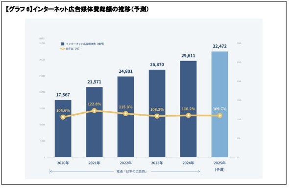 2025年のインターネット広告媒体費は、前年比109.7%の3兆2472億円になると予測されている。