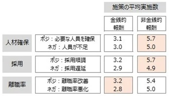 離職率の低下には「基本給の見直し」や「賞与の見直し」といった防衛的な金銭的報酬の実施が大きく寄与する傾向があった。一方、採用や人材確保では「柔軟な働き方の導入」や「成長機会の提供」などの非金銭的報酬が好影響を与えており、人材確保に関してポジティブな成果を上げている企業は、金銭的・非金銭的報酬施策を数多く取り入れていることが明らかに。