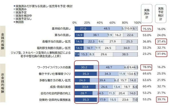 また、実施を予定及び検討している施策では、業務改善やDXなどの「効果的・効率的な業務改善」(39.1%)、「ジョブ型、スキルベース型などの人事制度改訂による若手中堅社員の賃金見直し(上昇)」(37.9%)、「各種手当の見直し・拡充」(37.4%)の3施策が4割近くに及んだ。